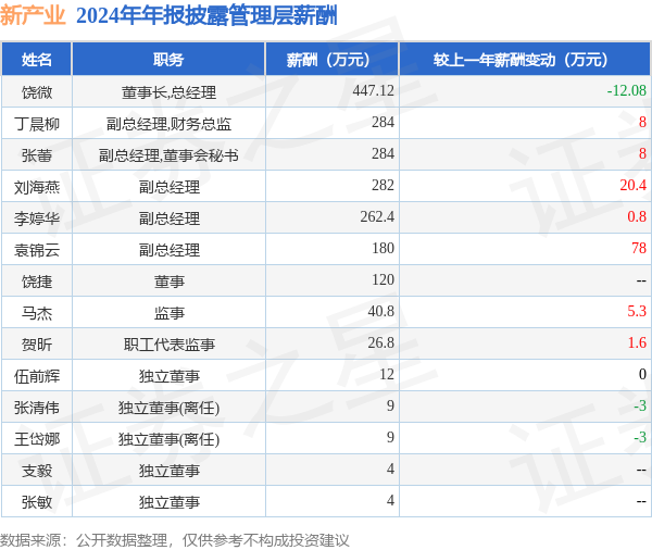 证券之星消息,新产业发布2024年年报,数据显示:公司主营收入45.35亿元,同比增15.41%。归母净利润为18.28亿元,同比增10.57%。扣非净利润为17.2亿元,同比增11.19%。当年公司员工总数2841人,同比增8.15%。人均薪酬29.85万元(注:"人均薪酬"根据定期报告中"应付职工薪酬"附注的本期增加值 / 员工总数计算而来),同比增7.27%。人均创收159.64万元,同比增6.72%。人均创利64.36万元,同比增2.24%。其中管理层薪酬总额为1965.12万元,同比上一年减1.76%,薪酬最高的为董事长,总经理饶微,薪酬447.12万元。