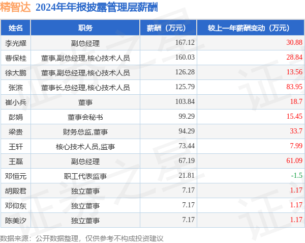 证券之星消息,精智达发布2024年年报,数据显示:公司主营收入8.03亿元,同比增23.83%。归母净利润为8016.02万元,同比减30.71%。扣非净利润为6885.57万元,同比减18.37%。当年公司员工总数588人,同比增14.84%。人均薪酬23.99万元(注:"人均薪酬"根据定期报告中"应付职工薪酬"附注的本期增加值 / 员工总数计算而来),同比增16.97%。人均创收136.59万元,同比增7.83%。人均创利13.56万元,同比减37.98%。其中管理层薪酬总额为1060.59万元,同比上一年增28.33%,薪酬最高的为副总经理李光耀,薪酬167.12万元。