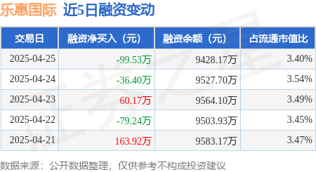 证券之星消息,4月25日,乐惠国际(603076)融资买入677.54万元,融资偿还777.07万元,融资净卖出99.53万元,融资余额9428.17万元。