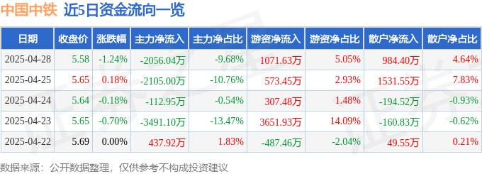 证券之星消息,截至2025年4月28日收盘,中国中铁(601390)报收于5.58元,下跌1.24%,换手率0.19%,成交量37.97万手,成交额2.12亿元。