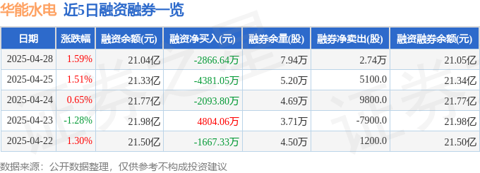华能水电融资融券信息显示,融资方面,当日融资买入3173.71万元,融资偿还6040.35万元,融资净偿还2866.64万元。融券方面,融券卖出4.82万股,融券偿还2.08万股,融券余量7.94万股,融券余额76.07万元。融资融券余额21.05亿元。