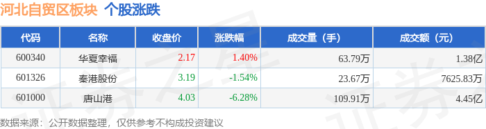 证券之星消息,4月29日河北自贸区板块较上一交易日下跌3.5%,唐山港领跌。当日上证指数报收于3286.65,下跌0.05%。深证成指报收于9849.8,下跌0.05%。河北自贸区板块个股涨跌见下表: