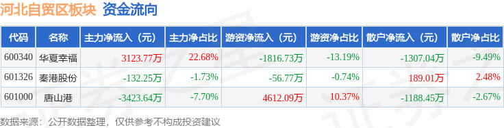 从资金流向上来看,当日河北自贸区板块主力资金净流出432.12万元,游资资金净流入2738.59万元,散户资金净流出2306.47万元。河北自贸区板块个股资金流向见下表: