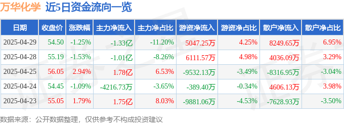 证券之星消息,截至2025年4月29日收盘,万华化学(600309)报收于54.5元,下跌1.25%,换手率0.69%,成交量21.74万手,成交额11.87亿元。