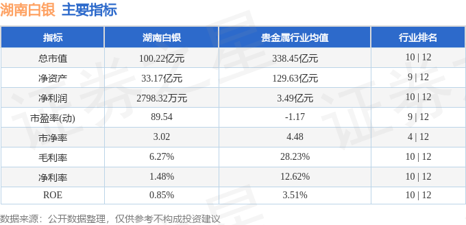 湖南白银2025年一季报显示,公司主营收入18.9亿元,同比上升19.01%;归母净利润2798.32万元,同比上升494.88%;扣非净利润2610.43万元,同比上升154.45%;负债率46.88%,投资收益-2.17万元,财务费用1507.12万元,毛利率6.27%。湖南白银(002716)主营业务:以白银冶炼和深加工为主,配套铅冶炼,并综合回收金、铋、锑、锌、铜、铟、钯等有价金属。