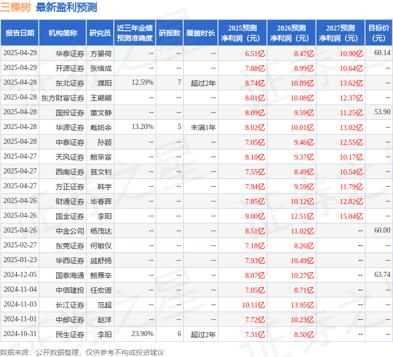 最新盈利预测明细如下: