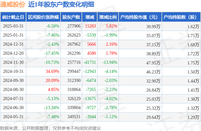 从股价来看,2025年1月31日至2025年3月31日,通威股份区间跌幅为6.5%,在此期间股东户数增加1.53万户,增幅为5.82%。