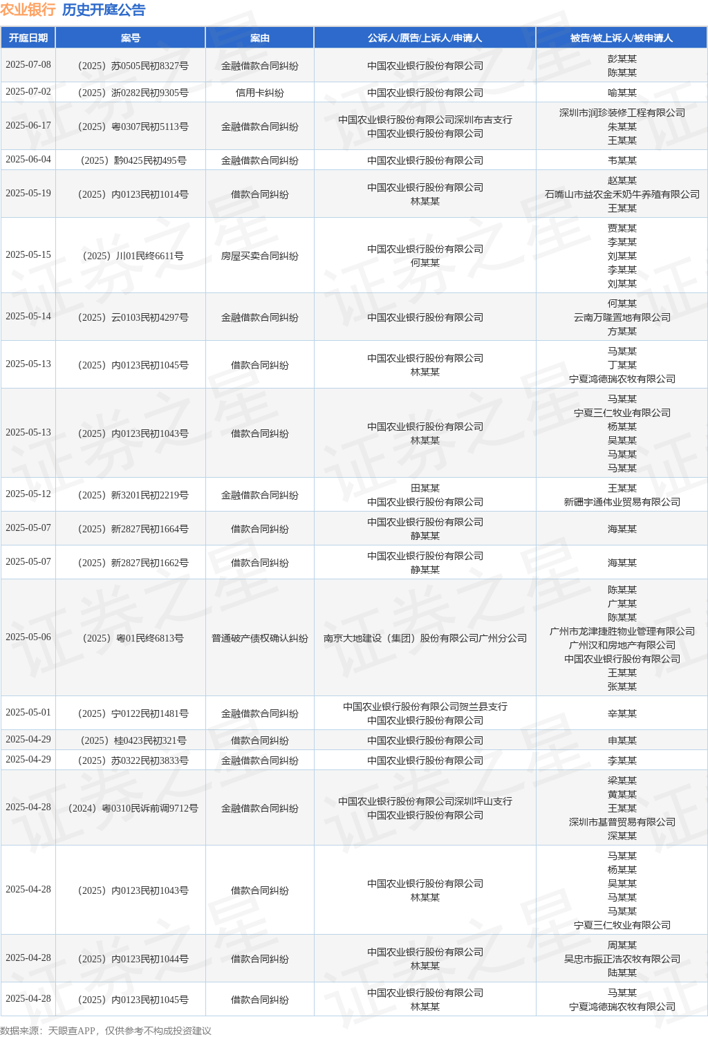 案号:(2025)粤01民终6813号根据统计,近一年内以中国农业银行股份有限公司为当事人的历史开庭公告有170则,其中案由为“金融借款合同纠纷”的公告以84则居首,其次为“信用卡纠纷”有47则,“借款合同纠纷”有20则。历史开庭公告(前20条)如下: