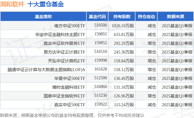 根据2025基金Q1季报公募基金重仓股数据,重仓该股的公募基金共64家,其中持有数量最多的公募基金为南方基金的南方中证500ETF。南方中证500ETF目前规模为948.72亿元,最新净值5.6288(4月30日),较上一交易日上涨0.48%,近一年上涨5.13%。该公募基金现任基金经理为罗文杰。罗文杰在任的基金产品包括:南方中证500ETF联接(LOF)A,管理时间为2013年4月22日至今,期间收益率为87.7%;南方沪深300ETF,管理时间为2013年5月17日至今,期间收益率为100.74%;南方沪深300ETF联接A,管理时间为2013年5月17日至今,期间收益率为92.11%。