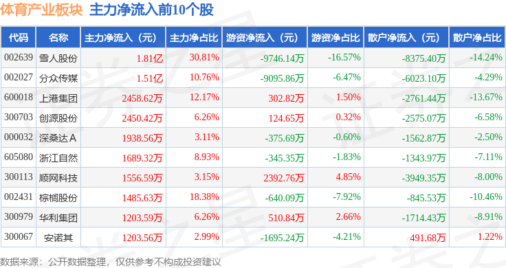 从资金流向上来看,当日体育产业板块主力资金净流出6.37亿元,游资资金净流入3301.47万元,散户资金净流入6.04亿元。体育产业板块个股资金流向见下表: