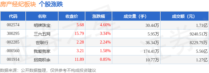 证券之星消息,5月6日房产经纪板块较上一交易日上涨1.82%,明牌珠宝领涨。当日上证指数报收于3316.11,上涨1.13%。深证成指报收于10082.33,上涨1.84%。房产经纪板块个股涨跌见下表: