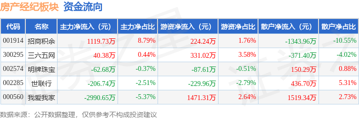 从资金流向上来看,当日房产经纪板块主力资金净流出2099.96万元,游资资金净流入1708.99万元,散户资金净流入390.97万元。房产经纪板块个股资金流向见下表: