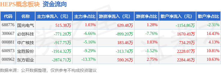 从资金流向上来看,当日HEPS概念板块主力资金净流出5962.69万元,游资资金净流入200.25万元,散户资金净流入5762.44万元。HEPS概念板块个股资金流向见下表: