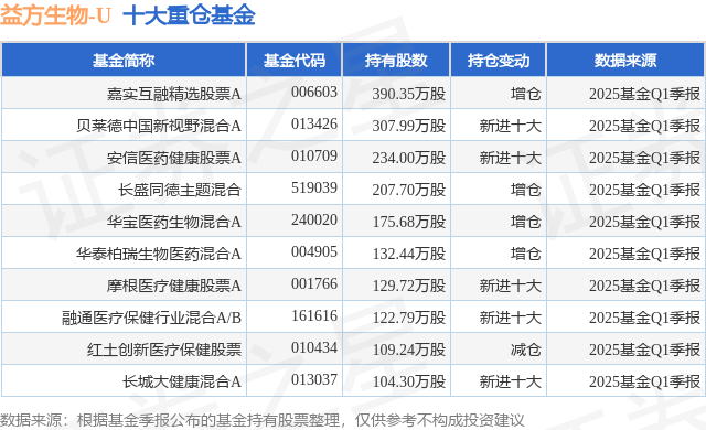 重仓益方生物-U的前十大公募基金请见下表: