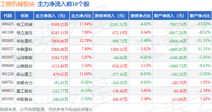 从资金流向上来看,当日工程机械板块主力资金净流入1.68亿元,游资资金净流入664.21万元,散户资金净流出1.75亿元。工程机械板块个股资金流向见下表: