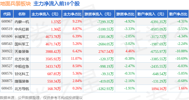 从资金流向上来看,当日地面兵装板块主力资金净流入4.53亿元,游资资金净流出1.49亿元,散户资金净流出3.05亿元。地面兵装板块个股资金流向见下表:
