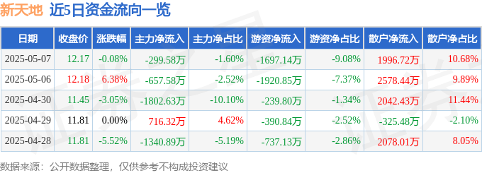 证券之星消息,截至2025年5月7日收盘,新天地(301277)报收于12.17元,下跌0.08%,换手率15.23%,成交量15.38万手,成交额1.87亿元。