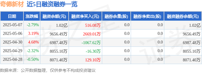 奇德新材融资融券信息显示,融资方面,当日融资买入2466.32万元,融资偿还1950.24万元,融资净买入516.08万元。融券方面,融券卖出0.0股,融券偿还0.0股,融券余量0.0股,融券余额0.0万元。融资融券余额1.02亿元。