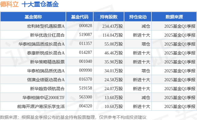 根据2025基金Q1季报公募基金重仓股数据,重仓该股的公募基金共13家,其中持有数量最多的公募基金为宏利基金的宏利转型机遇股票A。宏利转型机遇股票A目前规模为30.18亿元,最新净值2.299(5月7日),较上一交易日上涨0.26%,近一年上涨1.82%。该公募基金现任基金经理为孟杰。孟杰在任的基金产品包括:宏利睿智稳健混合A,管理时间为2020年9月7日至今,期间收益率为35.43%;宏利行业精选混合A,管理时间为2021年12月30日至今,期间收益率为-21.87%;宏利睿智成长混合A,管理时间为2024年5月14日至今,期间收益率为-3.54%;宏利半导体产业混合发起A,管理时间为2024年7月23日至今,期间收益率为21.9%。