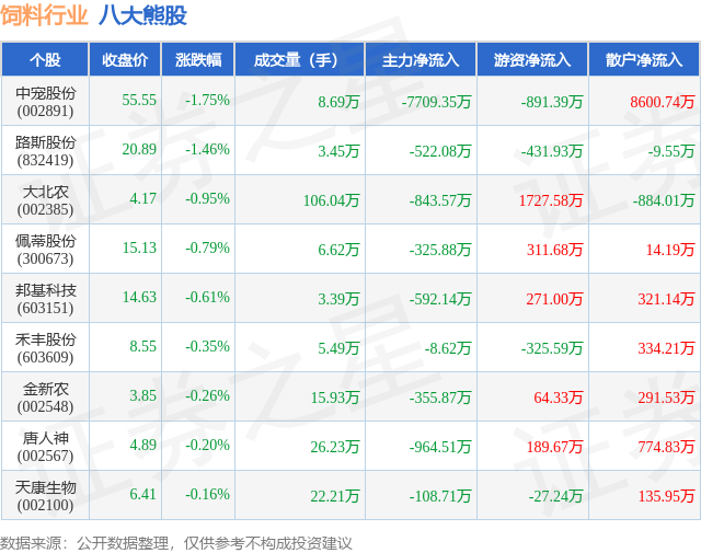 个股表现方面,饲料行业当日领跌股为中宠股份(002891),该股当日报收55.55,下跌1.75%,成交量8.69万,主力资金净流出7709.35万元。路斯股份(832419)以下跌1.46%紧随其后,该股当日成交量3.45万,主力资金净流出522.08万元。除此之外,大北农(002385)、佩蒂股份(300673)、邦基科技(603151)均进入当日熊股之列。具体个股列表见下表: