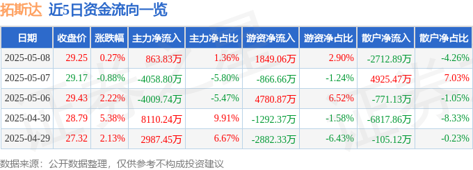 证券之星消息,截至2025年5月8日收盘,拓斯达(300607)报收于29.25元,上涨0.27%,换手率6.41%,成交量21.65万手,成交额6.37亿元。