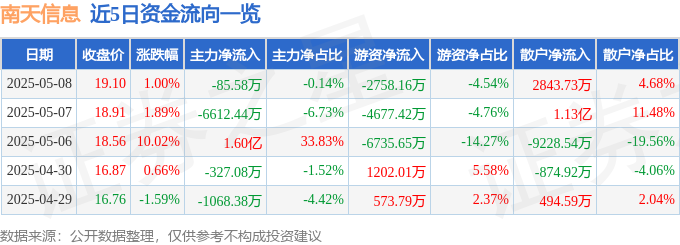 证券之星消息,截至2025年5月8日收盘,南天信息(000948)报收于19.1元,上涨1.0%,换手率8.22%,成交量31.98万手,成交额6.07亿元。