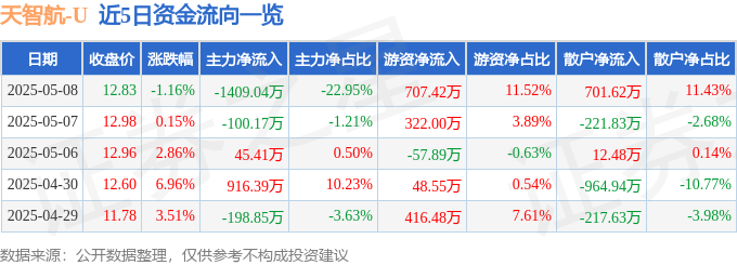 5月8日的资金流向数据方面,主力资金净流出1409.04万元,占总成交额22.95%,游资资金净流入707.42万元,占总成交额11.52%,散户资金净流入701.62万元,占总成交额11.43%。