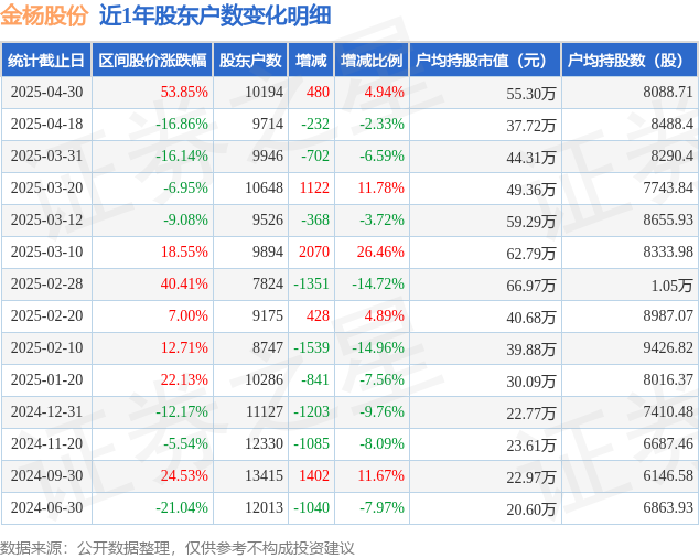 从股价来看,2025年4月18日至2025年4月30日,金杨股份区间涨幅为53.85%,在此期间股东户数增加480.0户,增幅为4.94%。
