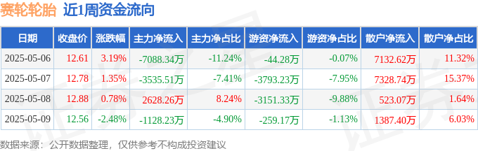 资金流向数据方面,本周赛轮轮胎主力资金合计净流出9123.83万元,游资资金合计净流出7248.01万元,散户资金合计净流入1.64亿元。本周资金流向一览见下表: