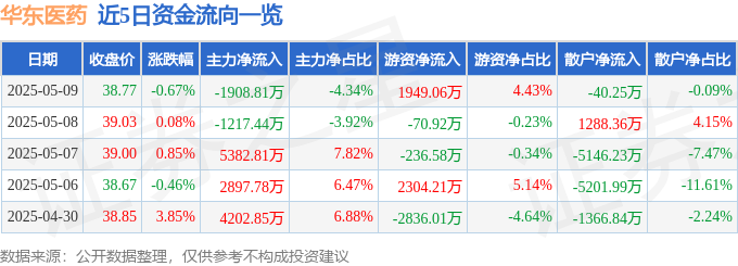 证券之星消息,截至2025年5月9日收盘,华东医药(000963)报收于38.77元,下跌0.67%,换手率0.64%,成交量11.23万手,成交额4.4亿元。