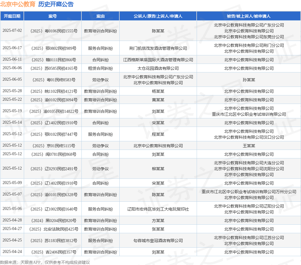 案号:(2025)辽1402民初1910号根据统计,近一年内以北京中公教育科技有限公司为当事人的历史开庭公告有512则,其中案由为“教育培训合同纠纷”的公告以365则居首,其次为“合同纠纷”有45则,“服务合同纠纷”有33则。历史开庭公告(前20条)如下:
