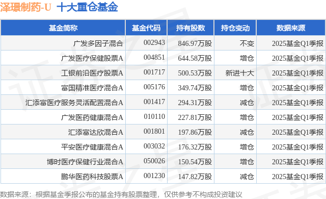 重仓泽璟制药-U的前十大公募基金请见下表: