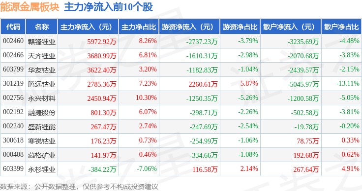 从资金流向上来看,当日能源金属板块主力资金净流入1.79亿元,游资资金净流出4400.89万元,散户资金净流出1.35亿元。能源金属板块个股资金流向见下表: