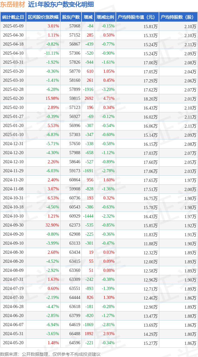从股价来看,2025年4月30日至2025年5月9日,东岳硅材区间涨幅为3.01%,在此期间股东户数减少84.0户,减幅为0.15%。