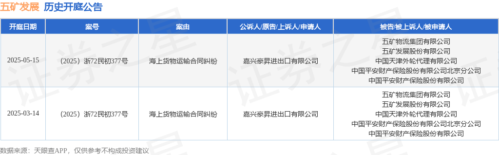 根据统计,近一年内以五矿发展股份有限公司为当事人的历史开庭公告有2则,其中案由为“海上货物运输合同纠纷”的公告以2则居首。历史开庭公告如下: