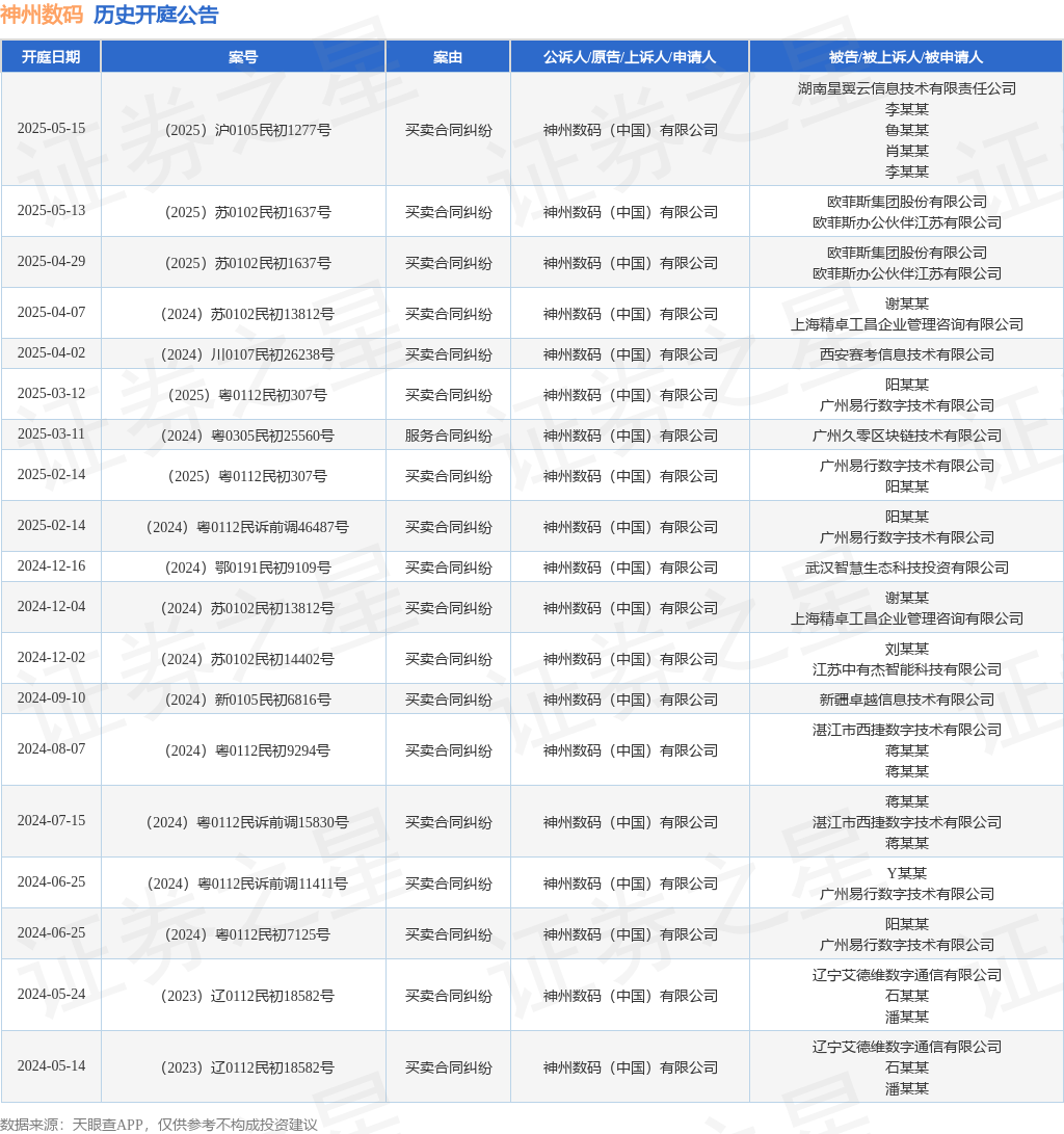 根据统计,近一年内以神州数码(中国)有限公司为当事人的历史开庭公告有19则,其中案由为“买卖合同纠纷”的公告以18则居首,其次为“服务合同纠纷”有1则。历史开庭公告如下: