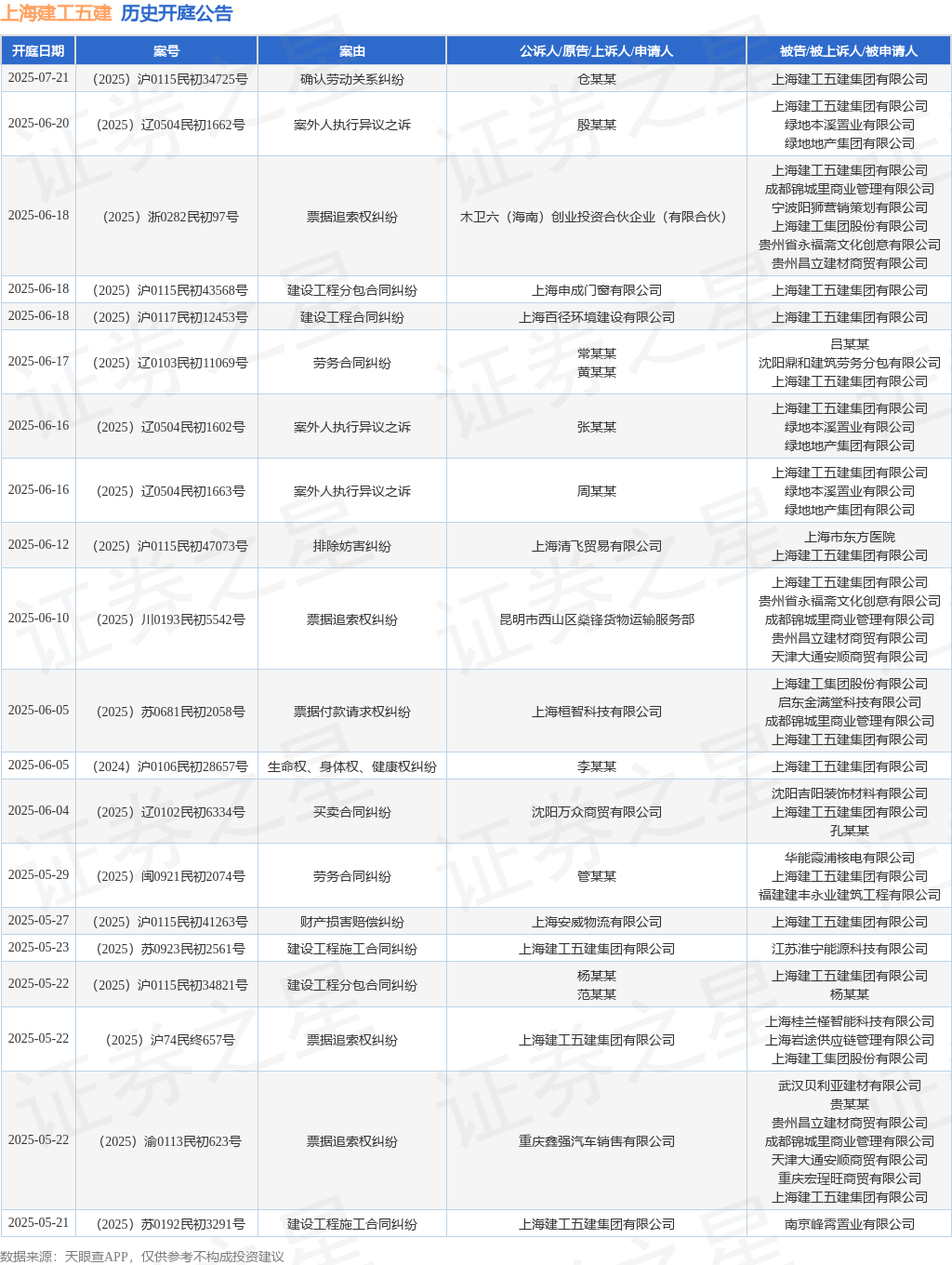 案号:(2025)辽0504民初1602号根据统计,近一年内以上海建工五建集团有限公司为当事人的历史开庭公告有319则,其中案由为“建设工程施工合同纠纷”的公告以81则居首,其次为“建设工程分包合同纠纷”有59则,“劳务合同纠纷”有37则。历史开庭公告(前20条)如下: