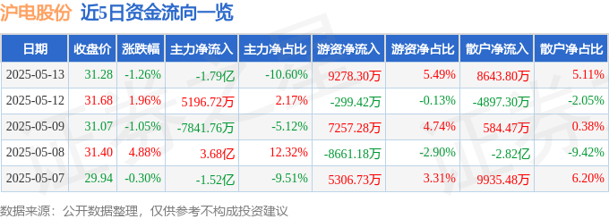 证券之星消息,截至2025年5月13日收盘,沪电股份(002463)报收于31.28元,下跌1.26%,换手率2.79%,成交量53.63万手,成交额16.9亿元。