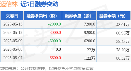 证券之星消息,5月13日,迈信林(688685)融资买入3381.18万元,融资偿还3518.62万元,融资净卖出137.44万元,融资余额5.58亿元,近20个交易日中有11个交易日出现融资净买入。