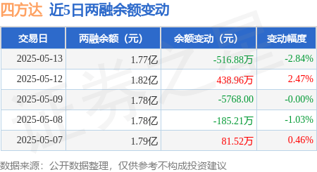证券之星消息,5月13日,四方达(300179)融资买入1084.96万元,融资偿还1601.84万元,融资净卖出516.88万元,融资余额1.77亿元。