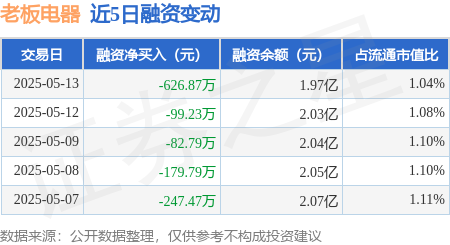 证券之星消息,5月13日,老板电器(002508)融资买入934.64万元,融资偿还1561.51万元,融资净卖出626.87万元,融资余额1.97亿元,近20个交易日中有12个交易日出现融资净买入。