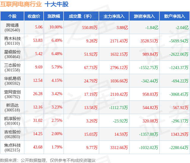 个股表现方面,互联网电商行业当日领涨股为跨境通(002640),该股当日报收5.06,上涨10.0%,成交量550.89万,主力资金净流入3.88亿元。青木科技(301110)以上涨6.49%紧随其后,该股当日成交量9.28万,主力资金净流入2171.43万元。除此之外,星徽股份(300464)、三态股份(301558)、华凯易佰(300592)均进入当日牛股之列。具体个股列表见下表: