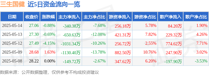 证券之星消息,截至2025年5月14日收盘,三生国健(688336)报收于27.06元,下跌0.88%,换手率0.26%,成交量1.63万手,成交额4434.17万元。