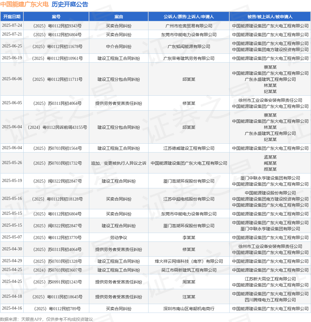 案号:(2025)粤0112民初18128号根据统计,近一年内以中国能源建设集团广东火电工程有限公司为当事人的历史开庭公告有148则,其中案由为“买卖合同纠纷”的公告以53则居首,其次为“建设工程施工合同纠纷”有33则,“劳动争议”有10则。历史开庭公告(前20条)如下: