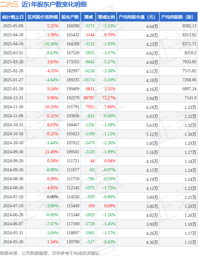从股价来看,2025年4月18日至2025年5月9日,二六三区间涨幅为5.25%,在此期间股东户数减少5172.0户,减幅为3.13%。