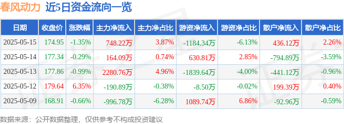 证券之星消息,截至2025年5月15日收盘,春风动力(603129)报收于174.95元,下跌1.35%,换手率0.73%,成交量1.11万手,成交额1.93亿元。