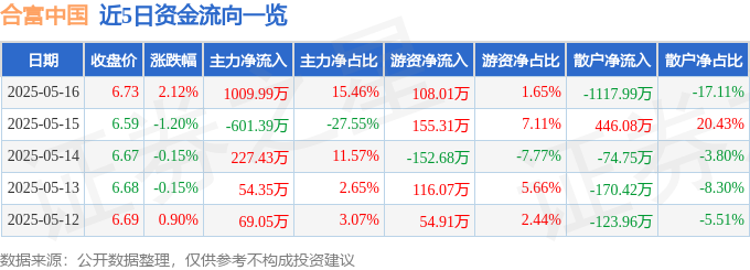 证券之星消息,截至2025年5月16日收盘,合富中国(603122)报收于6.73元,上涨2.12%,换手率2.43%,成交量9.67万手,成交额6534.92万元。