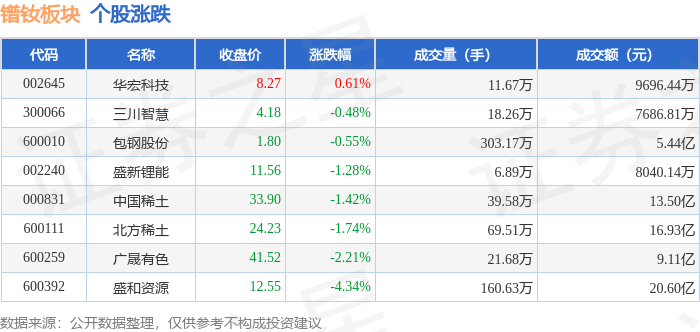 证券之星消息,5月16日镨钕板块较上一交易日下跌1.61%,盛和资源领跌。当日上证指数报收于3367.46,下跌0.4%。深证成指报收于10179.6,下跌0.07%。镨钕板块个股涨跌见下表:
