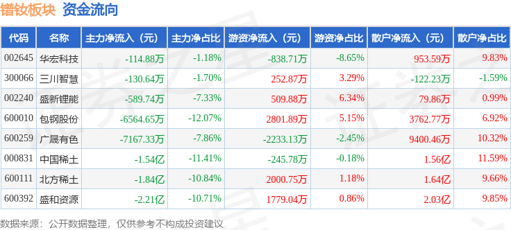 从资金流向上来看,当日镨钕板块主力资金净流出7.04亿元,游资资金净流入4026.81万元,散户资金净流入6.64亿元。镨钕板块个股资金流向见下表: