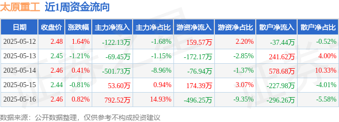 资金流向数据方面,本周太原重工主力资金合计净流入152.8万元,游资资金合计净流出411.41万元,散户资金合计净流入258.6万元。本周资金流向一览见下表: